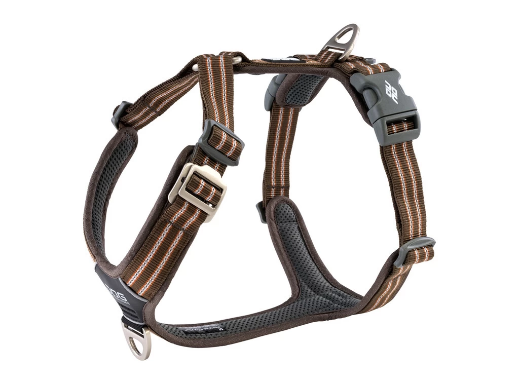 Het tuig heeft een ring op de rug voor normale aanlijning van het tuig en een ring aan de voorkant waarmee u het tuig als hulpmiddel voor anti trek training kunt gebruiken.