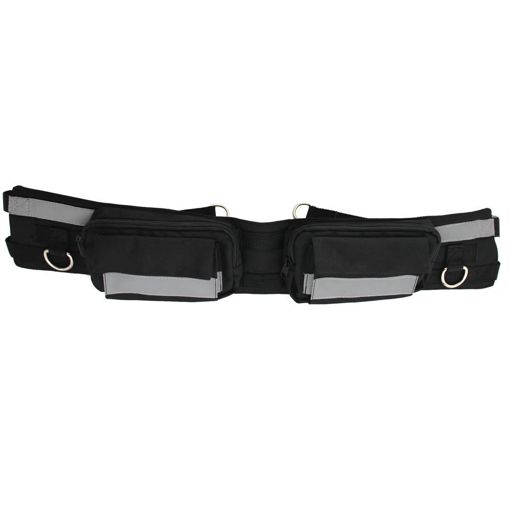 De heupgordel heeft 2 D-ringen aan de voorkant en 2 zijringen. Bij canicross/wandelen en bij trekkende honden worden alleen de ringen aan de voorkant gebruikt, de lijn gaat aan beide D ringen. De kracht van de hond word dan over de gehele heupgordel/rugdeel verdeeld. De zijringen zijn bijvoorbeeld geschikt om er een poepzak houder aan vast te maken, hier kan/mag de hond niet aan vast gemaakt worden. De ringen zijn vervaardigd uit Nikkel. Door de D-ringen aan de heupriemen (aan de voorkant) van de gordel kunt u met één of meerdere honden lopen in één keer in een hellingproef positie (voor canicross/hardlopen), u doet er dan een karabijn aan de de 2-D ringen.