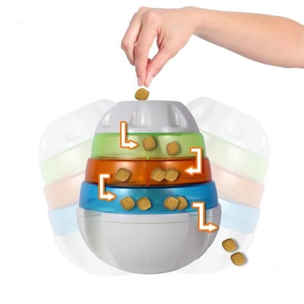 Deze leuke JW Treat Tower kan gevuld worden met lekkers, met de draaibare schijven met diverse gaten erin kunt u de moeilijkheid zelf bepalen, wanneer u alle gaten onder elkaar zet is het erg makkelijk wanneer u ze draait dan zal de hond de Tower vaker heen en weer moeten bewegen voordat het lekkers eruit valt. Gemaakt van non toxic kunststof.
