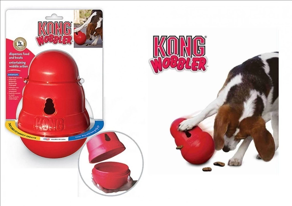 Deze Kong Wobbler kan gevuld worden met brokjes. De hond zal de Wobbler moeten bewegen want dan kunnen de brokjes eruit komen. Door het Tuimel effect zal de Wobbler weer omhoog komen en zal de hond actief moeten zijn.
