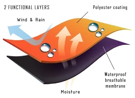 Regenjas met een waterdicht en ademend membraam dat lucht toevoert naar de vacht om broeien tegen te gaan.