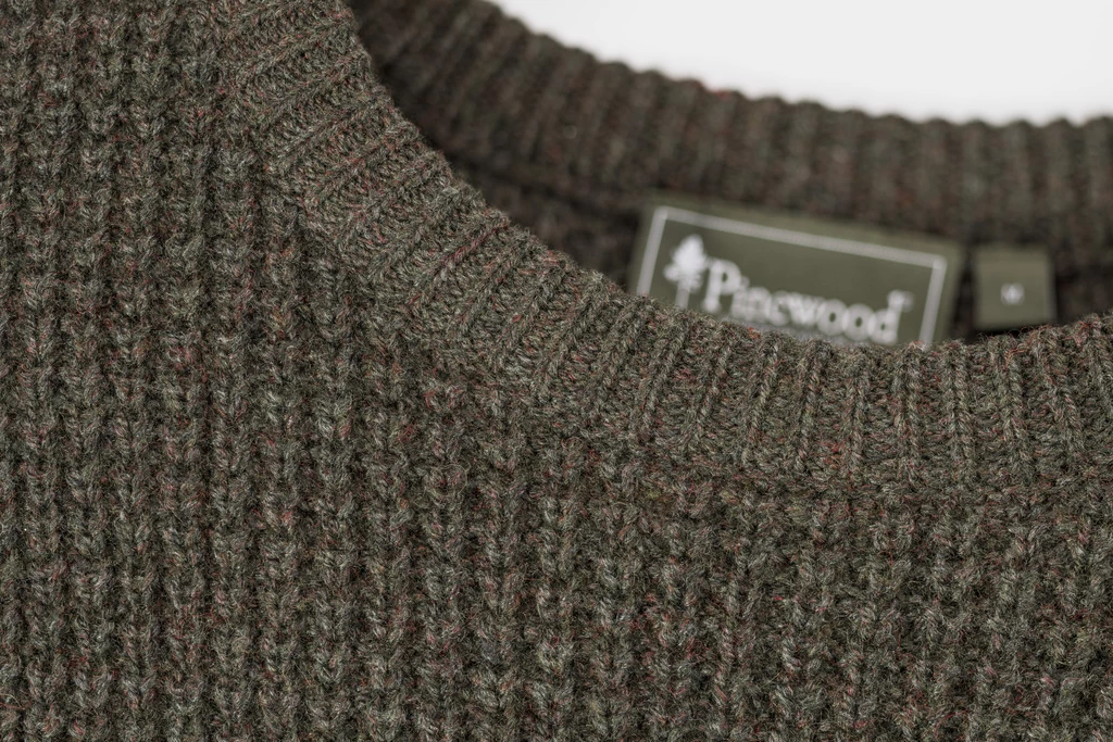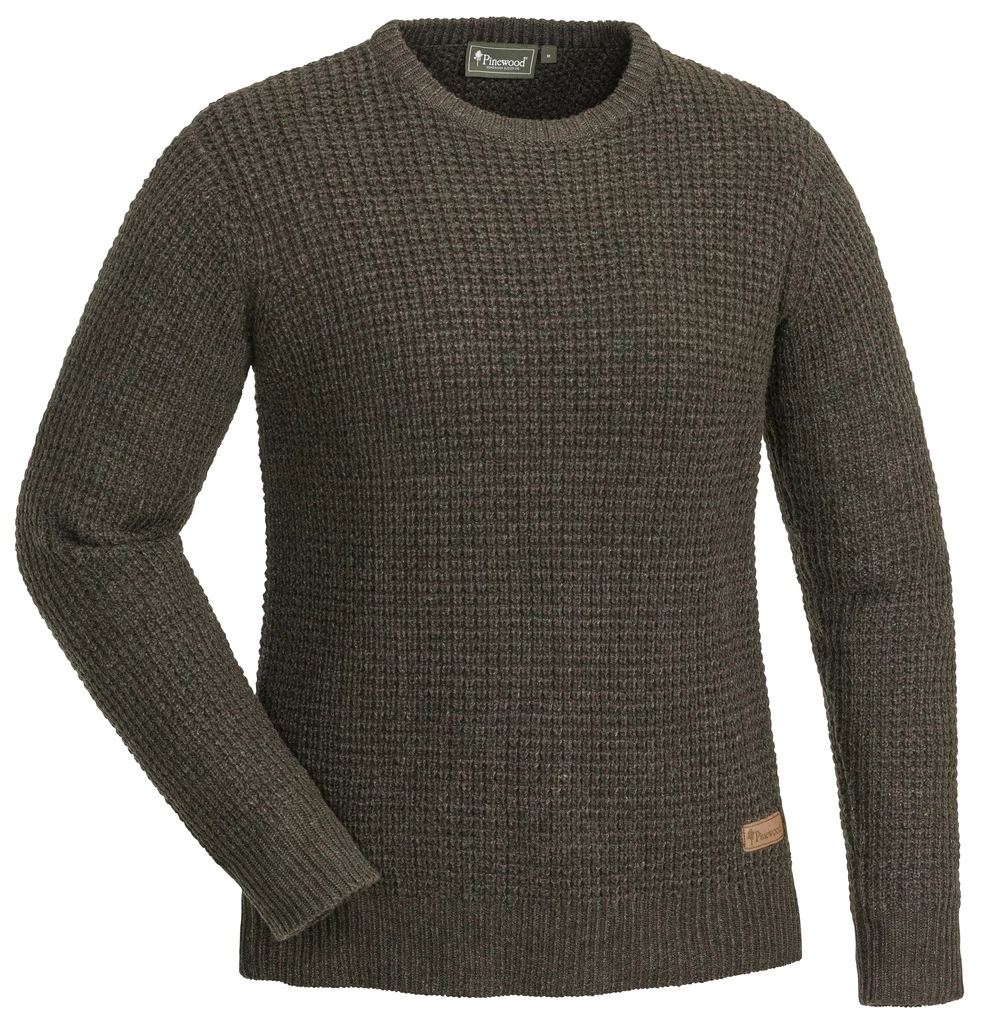 Melangekleurige sweater, ethisch geproduceerd uit Mulesing-vrije wol. Voorzien van Pinewoodlogo in synthetisch leder.