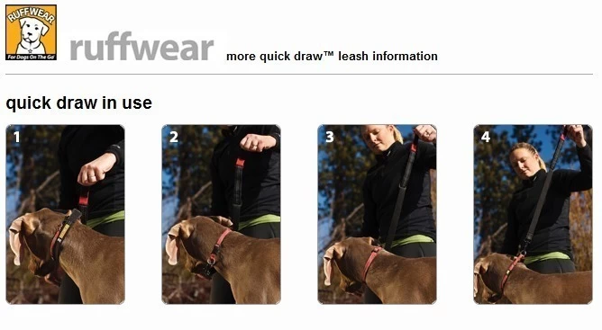 Snel een lijn van de hond pakken? Dan is de Quick Draw Leash handig. Doe de musketon van de Quick Draw Leash aan de eigen halsband van de hond en doe de lijn als het ware als een extra halsband om bij de hond door het klitteband aan elkaar vast te maken.