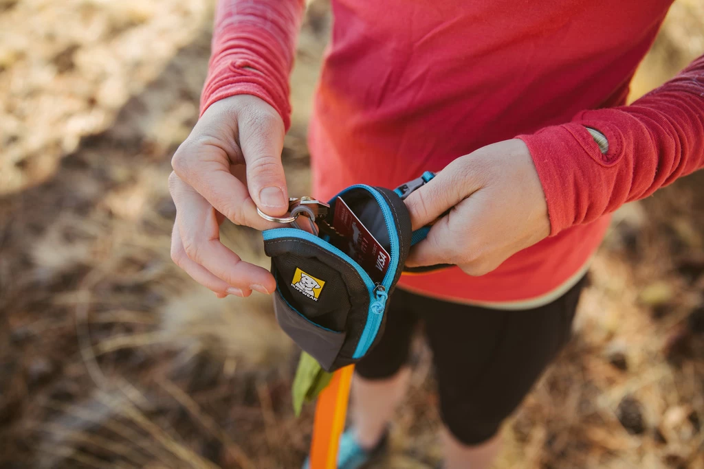 U kunt de stash bag makkelijk aan een lijn bevestigen door de (click)sluiting aan de achterkant die verstelbaar is, de extra klittenbandsluiting kunt u bijvoorbeeld gebruiken wanneer u de volgende lijnen om uw heupen gebruikt : Ruffwear Roamer Leash, Ruffwear Flat Out Leash of Ruffwear Slackline Leash.