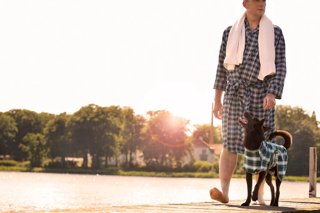 Uw hond afkoelen: Laat de Splash badjas in koud water weken. Het overtollige water uitwringen en bij de hond aantrekken tussen 30 minuten tot 1 uur.